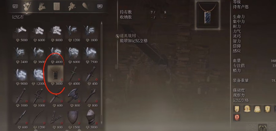 在任意赐福点坐下,就有着记忆系统选项,点击记忆后根据已有的记忆石数量,就可以在记忆空格中安装魔法或者祷告。法环内任意出生在一开始都是有着两个记忆空格,提升记忆空格的主要方式,就是依靠收集或购买得到的记忆石,永久增加记忆空格。除此之外游戏中名为“诺克史黛拉之月”的护符,也可以在穿戴后增加两个空格。对于法爷或者信仰流派的玩家来说,更多的记忆空格也是有着更方便的体验。
