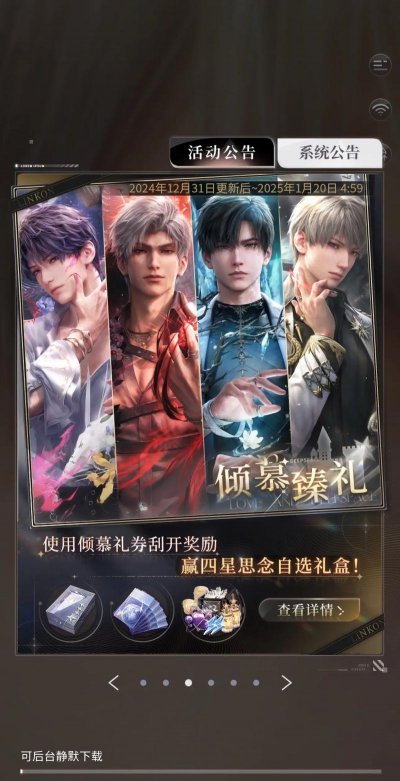 国内乙女品类标杆之作,以电影级镜头语言与细腻光影渲染营造强代入感氛围。采用双屏交互设计强化沉浸体验,结合语音演出、动态CG与实景录音技术提升情感传达精度。内容更新节奏稳定,定期推出新章节、限定活动与联动企划,持续拓展世界观边界与角色人格维度。