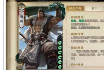然后是霸王”这个技能,在进行阵前对决的时候,将阵前对决的效果改为对目标造成1点伤害,每造成3次伤害,会添加1张阵前对决到手牌。这个技能的特点是修改阵前对决的结算规则,与项羽结算时,不需要双方大厨杀,而是直接对目标造成伤害。