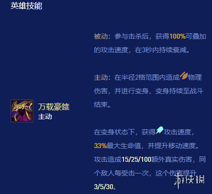 在变身状态下,获得攻击速度,33%最大生命值,并提升移动速度。攻击造成15/25/100额外真实伤害,同个敌人每受击一次,这个伤害提升3/5/30。