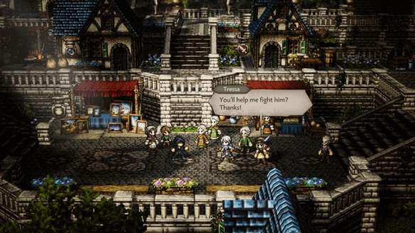 与旅馆左侧摊位前的闲散的店主对话,触发特蕾莎决定帮助他的剧情。