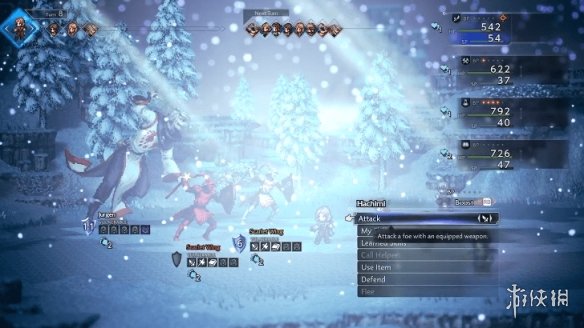 在游戏《歧路旅人0》中,尤根是一个与两名绯红之翼护卫一同出现的BOSS,拥有13点护盾值,弱点为剑、斧、弓、魔法书、暗。战斗核心在于优先清理护卫,并利用阿尔夫利克的加护等技能应对其施加的中毒状态。