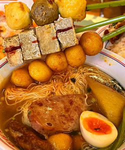 菜全由自己选择,可选择的有牛腩、猪红、猪皮、萝卜、豉油鸡翼以及各种丸类及蔬菜等等,一碗美味的车仔面可说是
