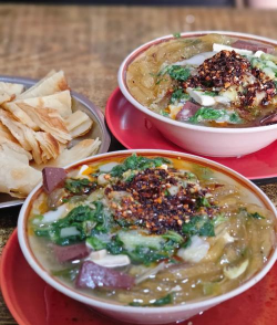 扁粉菜是安阳居民最爱吃的饭菜之一,每天,有很多上班一族和扁粉菜的老食客,会到自己经常去的排挡吃上一碗。扁粉菜以粉条做主料,配以青菜、豆腐、猪血等,在一口大铁锅中煮。扁粉菜的关键是高汤,高汤味道的好坏,直接影响扁粉菜的味道,因此,安阳扁粉菜经营者一只在高汤的做法上下功夫,使扁粉菜味道不断改善。吃扁粉菜的精髓在于辣椒,辣椒要香而微辣。早上,吃上一碗油滚滚,香喷喷、辣呼呼的扁粉菜,那叫舒服。所以,来到安阳,一定要尝一下