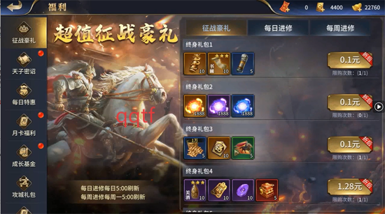 折扣后累充10000元红将演武令*400、100万资源自选包*20、天山雪莲*50、豪华材料自选箱*15
